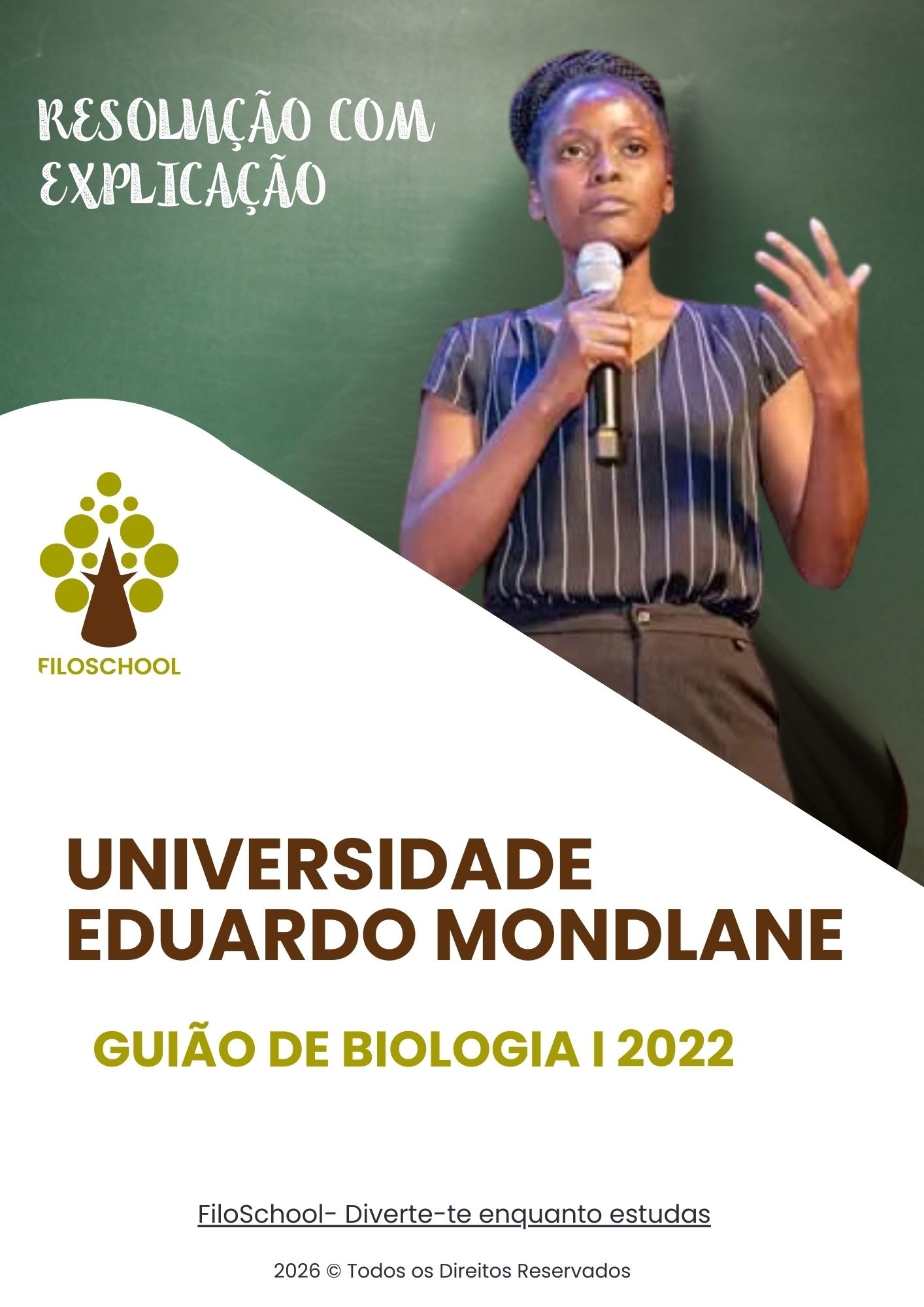 Guião de exames resolvidos da plataforma FILOSCHOOL, especificamente focado no Exame de Biologia 1 de 2024 da Universidade Eduardo Mondlane (UEM). O material apresenta uma coleção de 40 questões de múltipla escolha acompanhadas de justificativas técnicas detalhadas, abrangendo tópicos fundamentais da biologia como citologia, onde discute a função das mitocôndrias na atividade metabólica e a síntese proteica nos ribossomas , e botânica, detalhando processos como a osmose em células vegetais, a fotossíntese no cloroplasto e a estrutura de tecidos como o xilema e o floema. Além disso, o guia aborda a zoologia e fisiologia humana, diferenciando tecidos musculares, descrevendo o sistema circulatório de cordados e explicando patologias como a anemia decorrente da queda de eritrócitos. Ao longo de todo o texto, são disponibilizados contactos de assistência via WhatsApp para auxiliar estudantes de diversos níveis académicos na sua preparação.